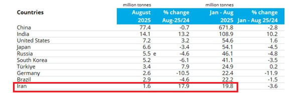 تولید جهانی فولاد نیز طی ماه آگوست ۲۰۲۵ کاهش اندکی را نشان میدهد. ۷۰ کشور تولیدکننده فولاد در مجموع ۱۴۵.۳ میلیون تن فولاد تولید کردهاند که نسبت به آگوست سال گذشته ۰.۳ درصد کاهش یافته است. همچنین تولید جهانی فولاد در هشت ماهه نخست سال ۲۰۲۵ به ۱۲۳۰.۶ میلیون تن رسیده که نسبت به مدت مشابه سال قبل ۱.۷ درصد کمتر است. این آمار به خوبی نشان میدهد که در شرایط رکود جهانی، فولاد ایران با روندی صعودی توانسته جایگاه استراتژیک خود را در بازارهای جهانی حفظ کند.
